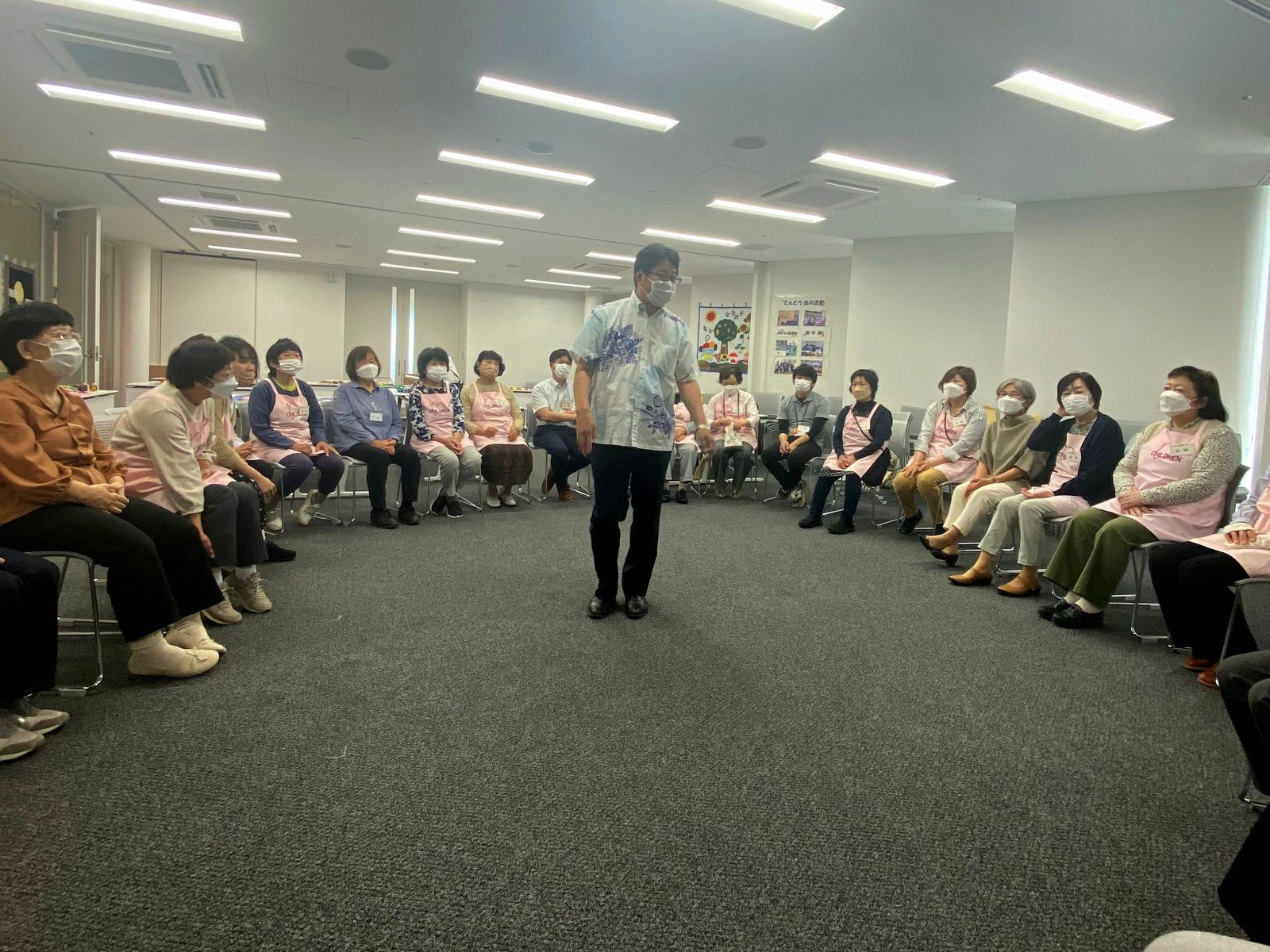 講師の中根真先生の講演では、まず先生より、机をどけて丸くなりお互いに顔を見あって座りましょう、と提案をいただきました。お互いの表情をみて話し合ったり、ゲームをしたりする中で、私たちの表情や態度によってより気持ちが伝え合えることを体感しました。そして、「おもちゃ図書館の活動をマラソンに例えるなら、私たちの役割は子どもたちや若いお母さんの“良き伴走者”になること、“良き伴走者”になるためには社会の状況や子どもの環境について常によく理解する努力を怠ってはならないこと」を教えていただきました。