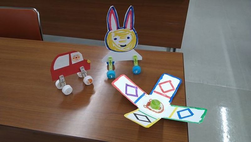 水を入れ蓋をして逆さまにして、ゆっくりそれらが落ちるのを眺めるおもちゃや紙コップを切り、マーカーで色をぬるコマなど、身近な材料で簡単に作れる楽しいおもちゃの作り方を教えていただきました。各おもちゃ図書館で親子で作り遊べると思います!有難うございました。