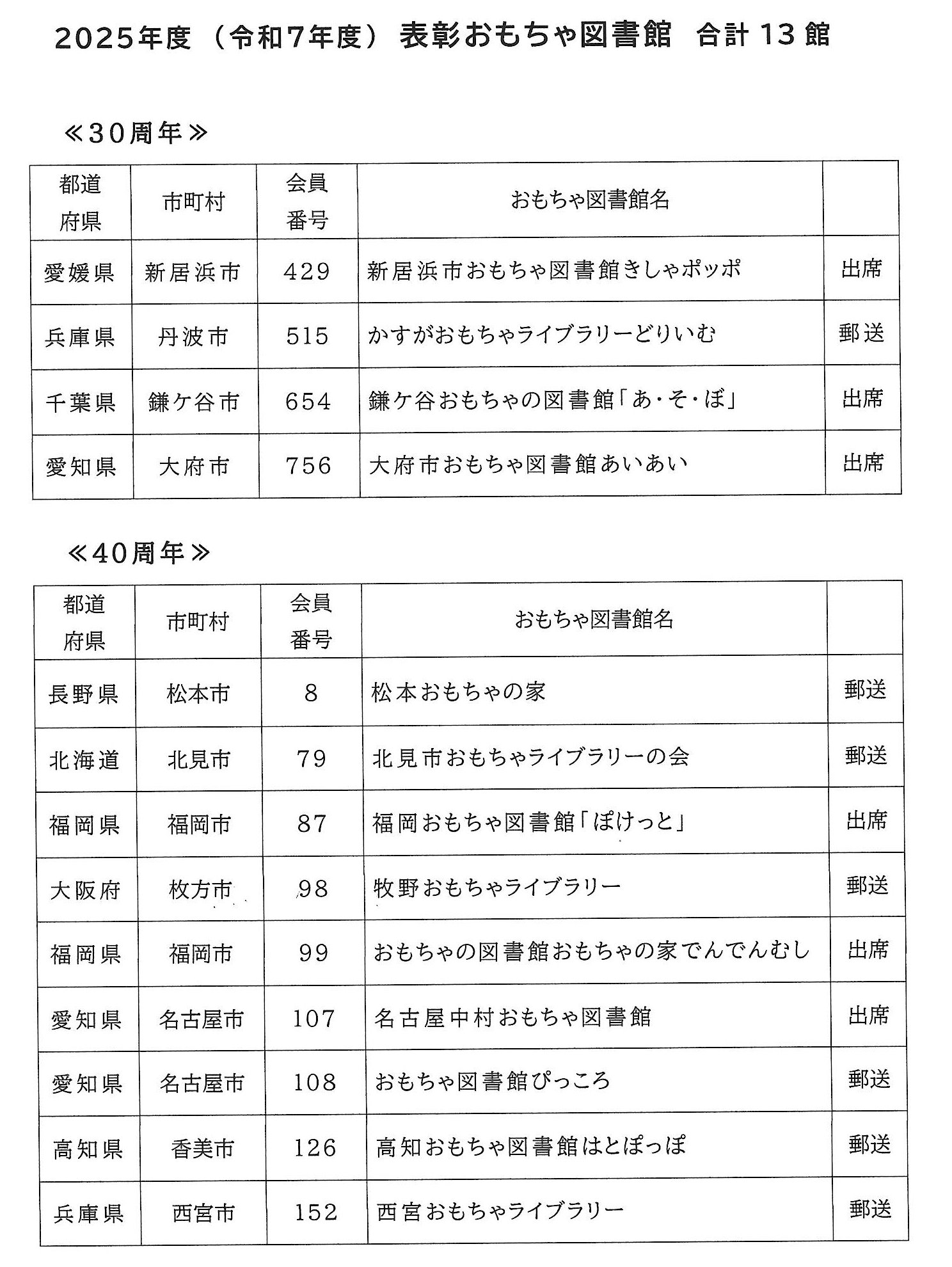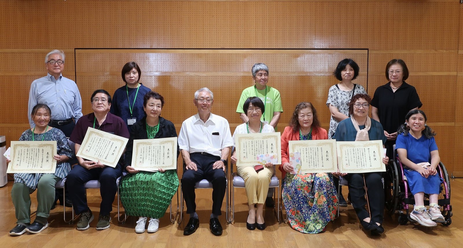 その後、設立から40年や30年にわたって活動を続けてきた6つのおもちゃ図書館が出席し、(一財)日本 おもちゃ図書館財団の山科誠代表理事から表彰状と記念品を受けました。長い間、地域の居場所づくりにかかわってきた皆さん、おめでとうございます。