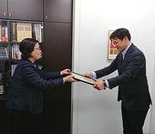 『マイバッグづくり』を提案してくださり、2018年から5年間にわたり布バックやマジックを寄贈、希望するおもちゃ図書館に配布までしていただきました。おもちゃ図書館ではすっかりマイバッグづくりが定着し、コロナ禍においても工夫を重ねてのマイバッグづくりが展開されてきました。この日、鈴木訪子理事長から松本健社長へ、感謝状と全国のおもちゃ図書館から寄せられた『マイバックづくり』の報告や写真のファイルを贈呈し、その後制作されたマイバッグ作品や子どもたちの様子について感想を交わしました。「これからも、おもちゃ図書館の子どもたちが笑顔になれる応援を続けたい」との松本社長の言葉に、心から感謝をいたしました。
