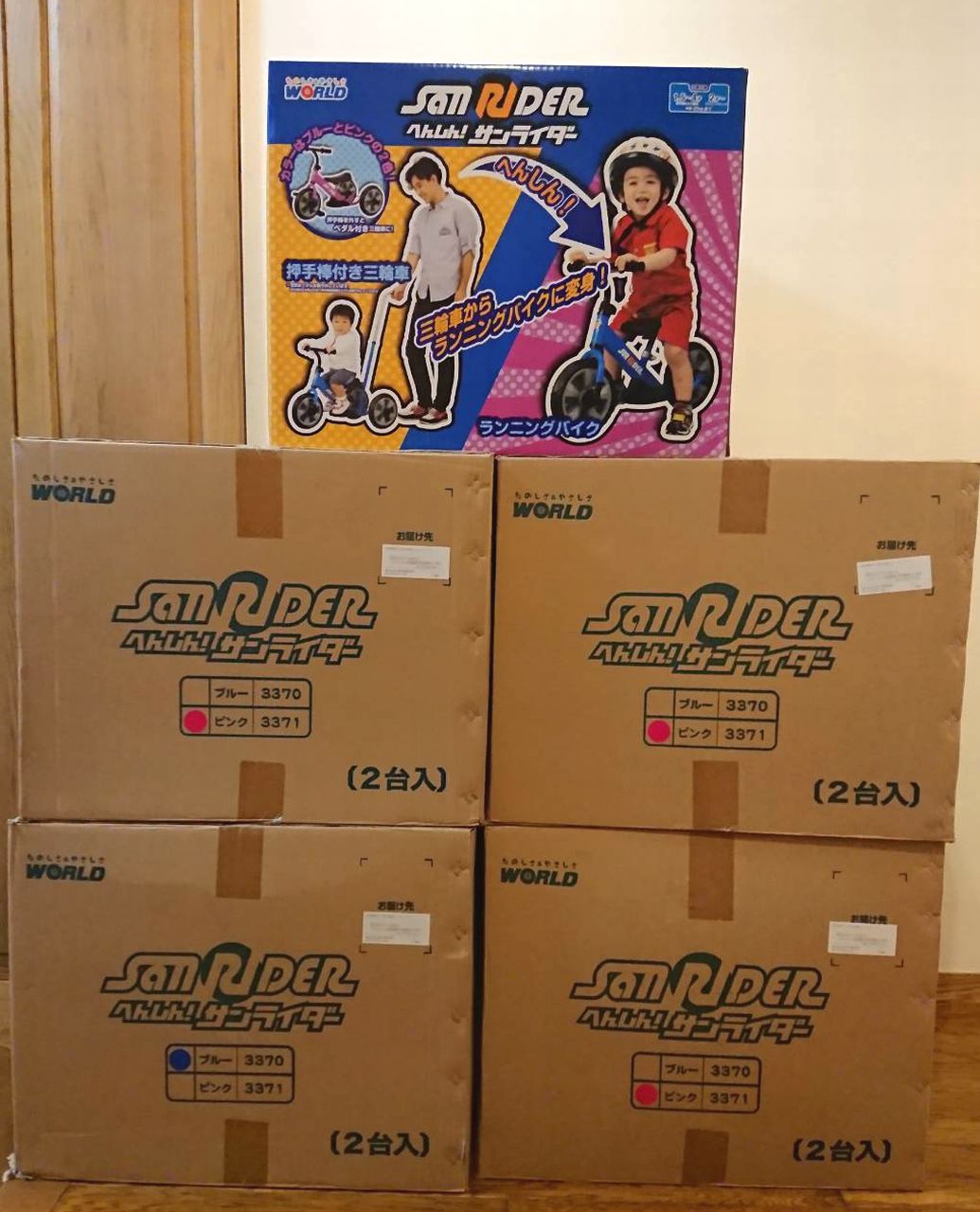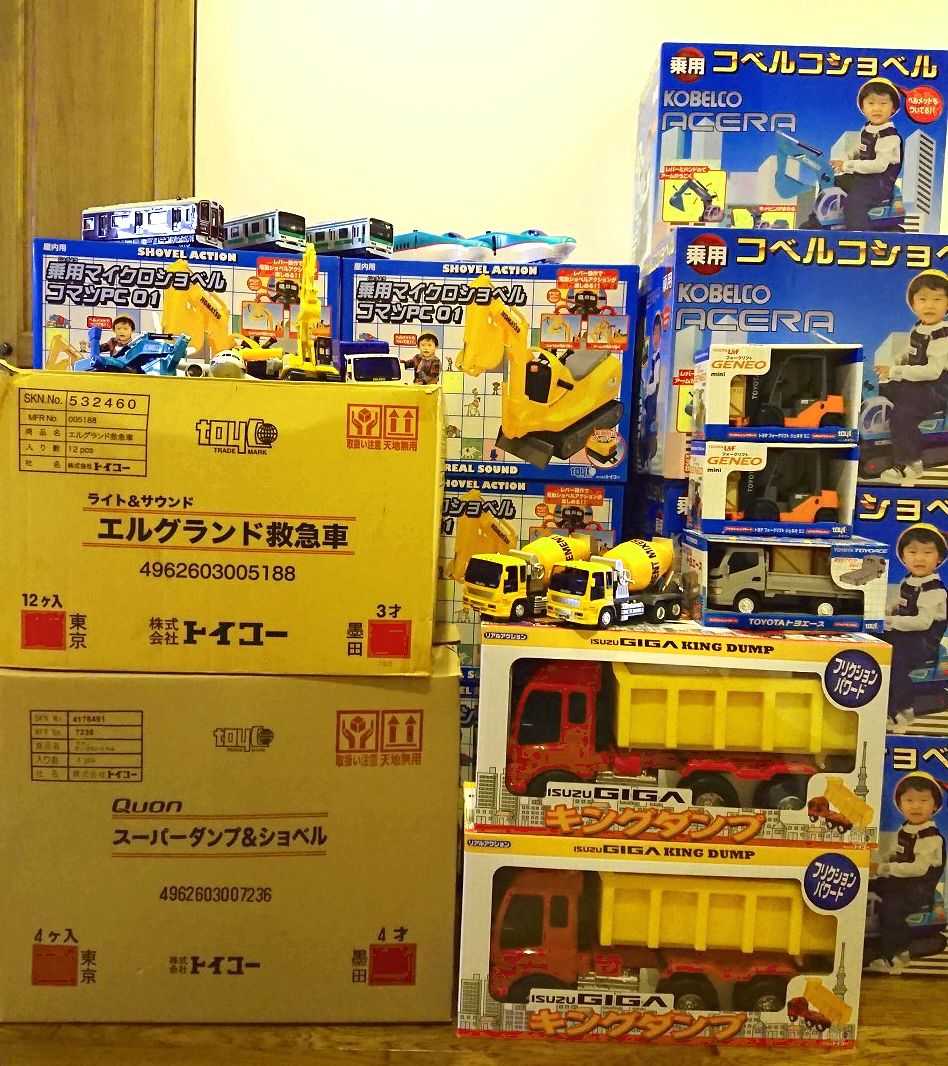 からたくさんの寄贈おもちゃが着きました。段ボール箱28箱に、「くみたてホィール」のショベルカー、RCパワーローダ、RC放水車、はしご車、そして「なかよしサンガ」「ジェーミーズ」合わせて162個のおもちゃが入っていました。