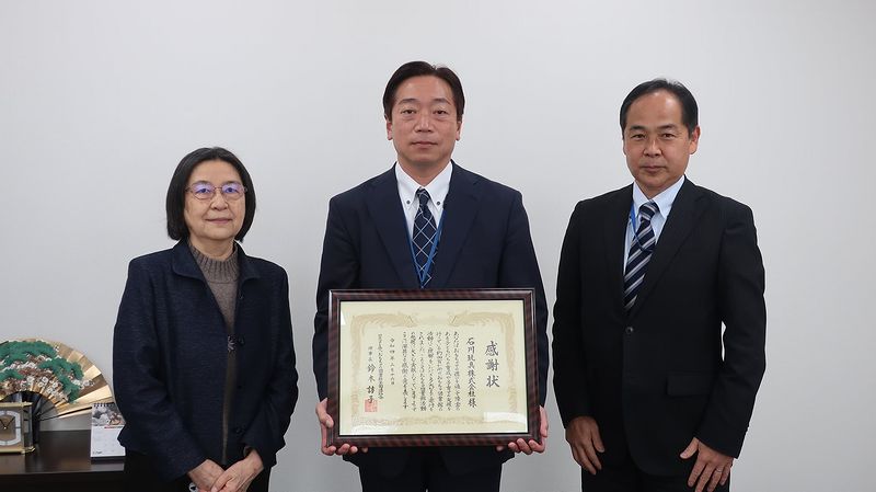 小泉副理事長から、中村幸一社長と髙木厚司取締役に感謝状をお渡しし、感謝の気持ちをお伝えいたしました。石川玩具様には、全国連絡会がおもちゃ図書館に送るおもちゃの購入で長年お世話になったほか、東京おもちゃショーの開催時などにたくさんのおもちゃを寄贈していただいてきました。本当にありがとうございました。感謝状の贈呈後、今年6月の東京おもちゃショーのお話や、先代社長さんが日本おもちゃ図書館財団の副理事長を務めていたころの話もでて、とても楽しい贈呈式となりました。