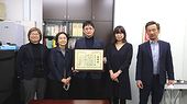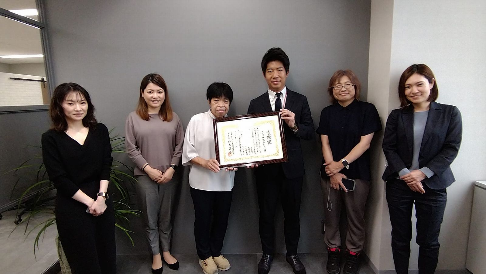 小泉康代副理事長から感謝状を佐藤靖代表取締役に贈呈、スタッフの方、仲介をいただいた税理士の増保雪絵さんとともに、写真撮影を行いました。